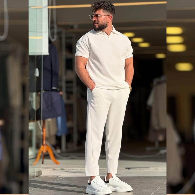 تميّز بإطلالة راقية مع طقم رجالي بتصميم عصري مفتوح الرقبة، يجمع بين النظافة، البساطة والفخامة ليمنحك حضورًا ملفتًا في أي مناسبة.